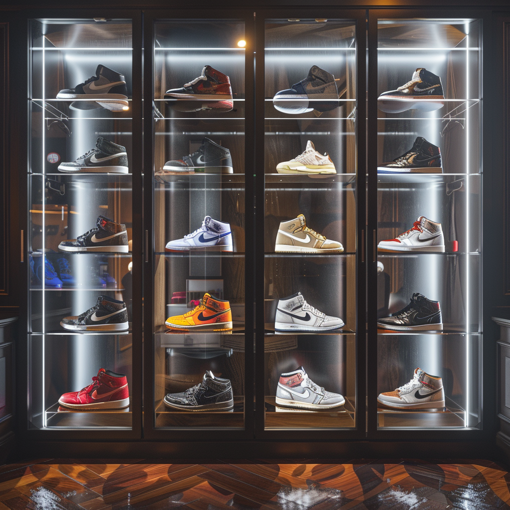 Pour les collections importantes (20+ paires), une vitrine avec déhumidificateur intégré est un investissement rentable. Marques à considérer : IKEA Detolf (accessible), ou des vitrines sneaker dédiées chinoises (retrouvables sur AliExpress pour 200-400 CHF).